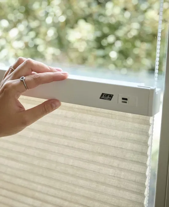 Omdat alleen de bovenrail gemotoriseerd is, blijft het systeem subtiel én toegankelijk. Verkrijgbaar in Duette® Shades en plissé shades, met verschillende hardwarekleuren, zodat het perfect aansluit bij jouw interieur.