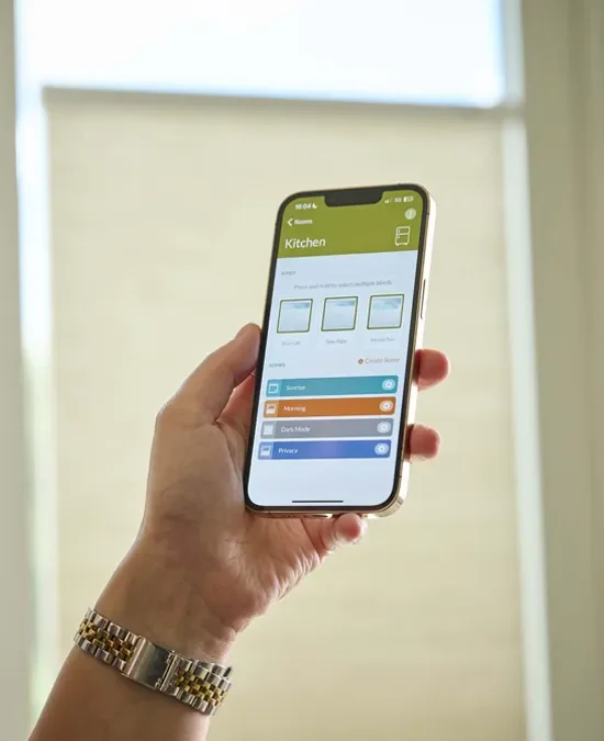 Wat deze nieuwe innovatie extra bijzonder maakt, is dat je scènes kunt instellen die passen bij jouw dag. Word wakker met gefilterd ochtendlicht. Laat de raamdecoratie automatisch zakken wanneer de zon feller wordt. Creëer ’s avonds een gevoel van geborgenheid met meer privacy.