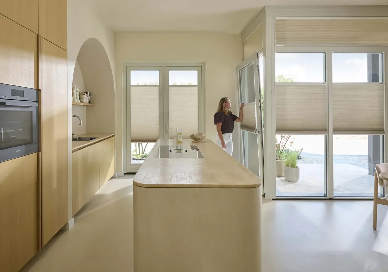 Voor wie draai-kiepramen heeft, voelt DuoMotion™ als een slimme ontdekking. Dankzij het opgespannen systeem blijft de raamdecoratie strak op zijn plaats, ook wanneer het raam open of gekanteld is. De raamkruk blijft goed bereikbaar en de uitstraling blijft rustig en verfijnd.
